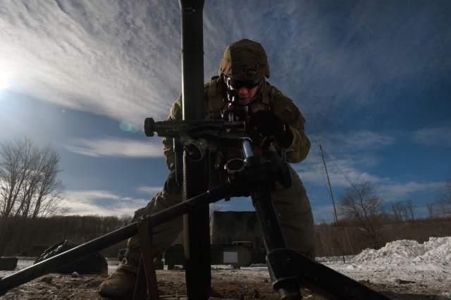 CAMP GRAYLING, Mich. – A frigid winter wind fluttered past the snow-covered landscape as Sgt. Shane Vanderhoek, an indirect fire infantryman with Headquarters and Headquarters Company, 1st Battalion, 125th Infantry Regiment, Michigan Army National Guard, adjusted his team’s 81 mm mortar.