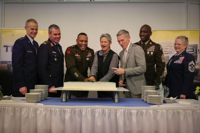 (From left to right) U.S. Air Force Maj. Gen. Derek France, commander, Third Air Force, German Bundeswehr Maj. Gen. Gerald Funke, commander, Logistics Command of the German Armed Forces, U.S. Army Maj. Gen. Ronald Ragin, commanding general, 21st Theater Sustainment Command, Beate Kimmel, Lord Mayor of Kaiserslautern, Ralf Lessmeister, district administrator Kaiserslautern, U.S. Army Command Sgt. Maj. Kofie Primus, senior enlisted advisor, 21st Theater Sustainment Command, and U.S. Air Force Chief Master Sgt. Stephanie Cates, command chief, of the 3rd Air Force, cut a cake together at the ‘Commanding General’s New Year Reception’ to officially usher in the New Year at the Armstrong Club, Vogelweh Military Complex, Kaiserslautern, Germany, on Jan. 26, 2024. The 21st TSC command team invited U.S. and partner nations to the reception to build upon relationships and create new ones, as well as ushering in the new year with a celebration for the continued partnerships between the nations. (U.S. Army photo by Spc. Samuel Signor) (Photo Credit: Spc. Samuel Signor)