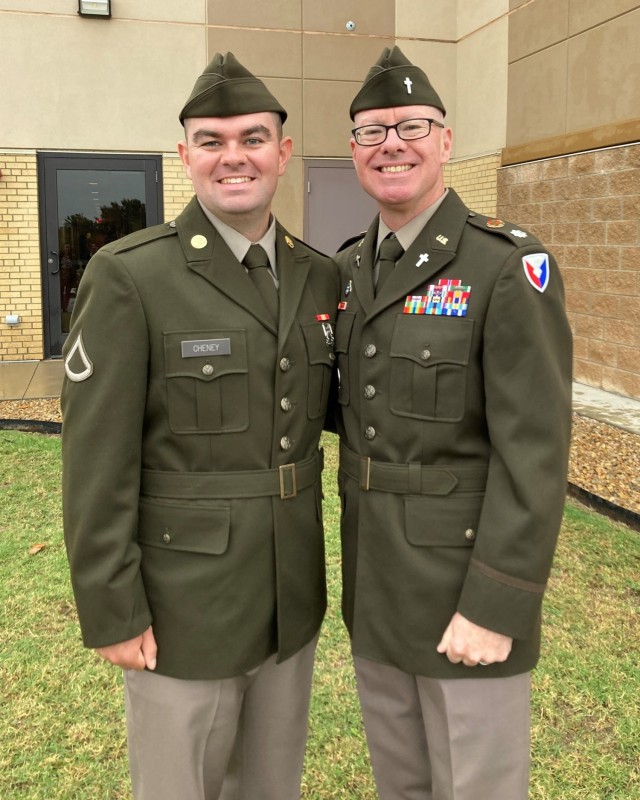 Lt. Col. Todd Cheney, deputy garrison chaplain for U.S Army Garrison Rheinland-Pfalz in Baumholder, Germany, (right) stands by his son, Private 1st Class Kyle Cheney, who recently joined the U.S. Army and is stationed at Fort Campbell, Kentucky. (Photo credit: Kristin Cheney)