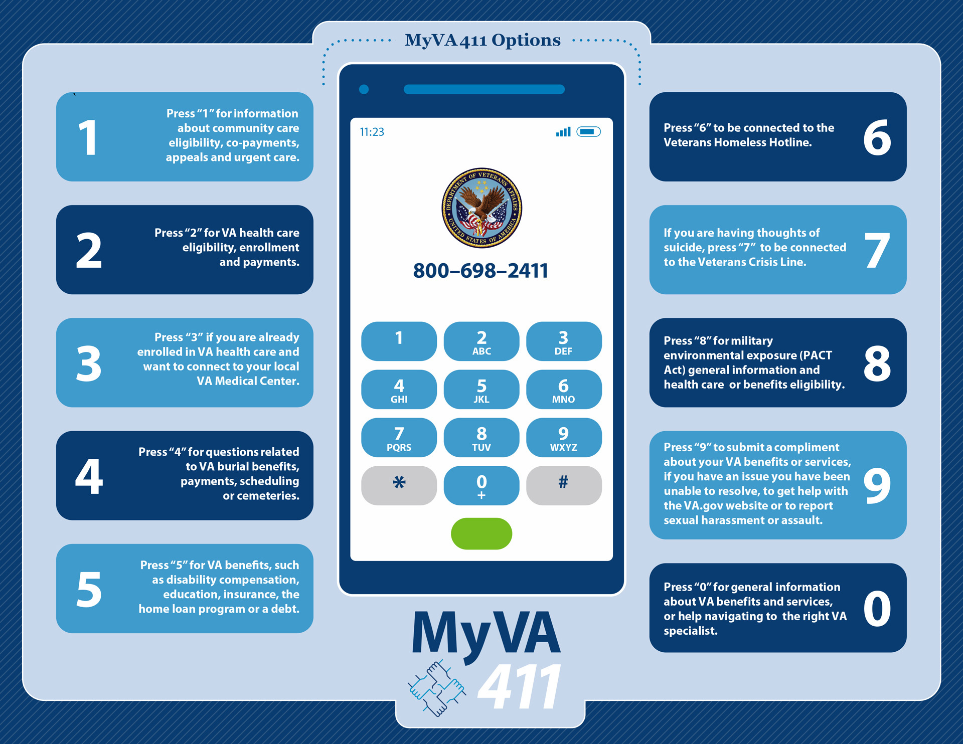 1-800-MyVA411 (1-800-698-2411) is an easy-to-remember phone number linking Veterans to VA resources. Established in 2020, it’s a “front door” for callers to talk to VA. Callers can “share concerns, offer recommendations, or ask questions” about VA care, benefits and services.
