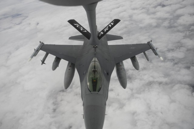 A U.S. Air Force F-16 Fighting Falcon aircraft assigned to the 31st Fighter Wing receives fuel from a KC-135 Stratotanker aircraft assigned to the 100th Air Refueling Wing over Morocco during Exercise African Lion 2021, June 18, 2021. KC-135s support fighter aircraft in the creation of a safe, stable and secure Africa.