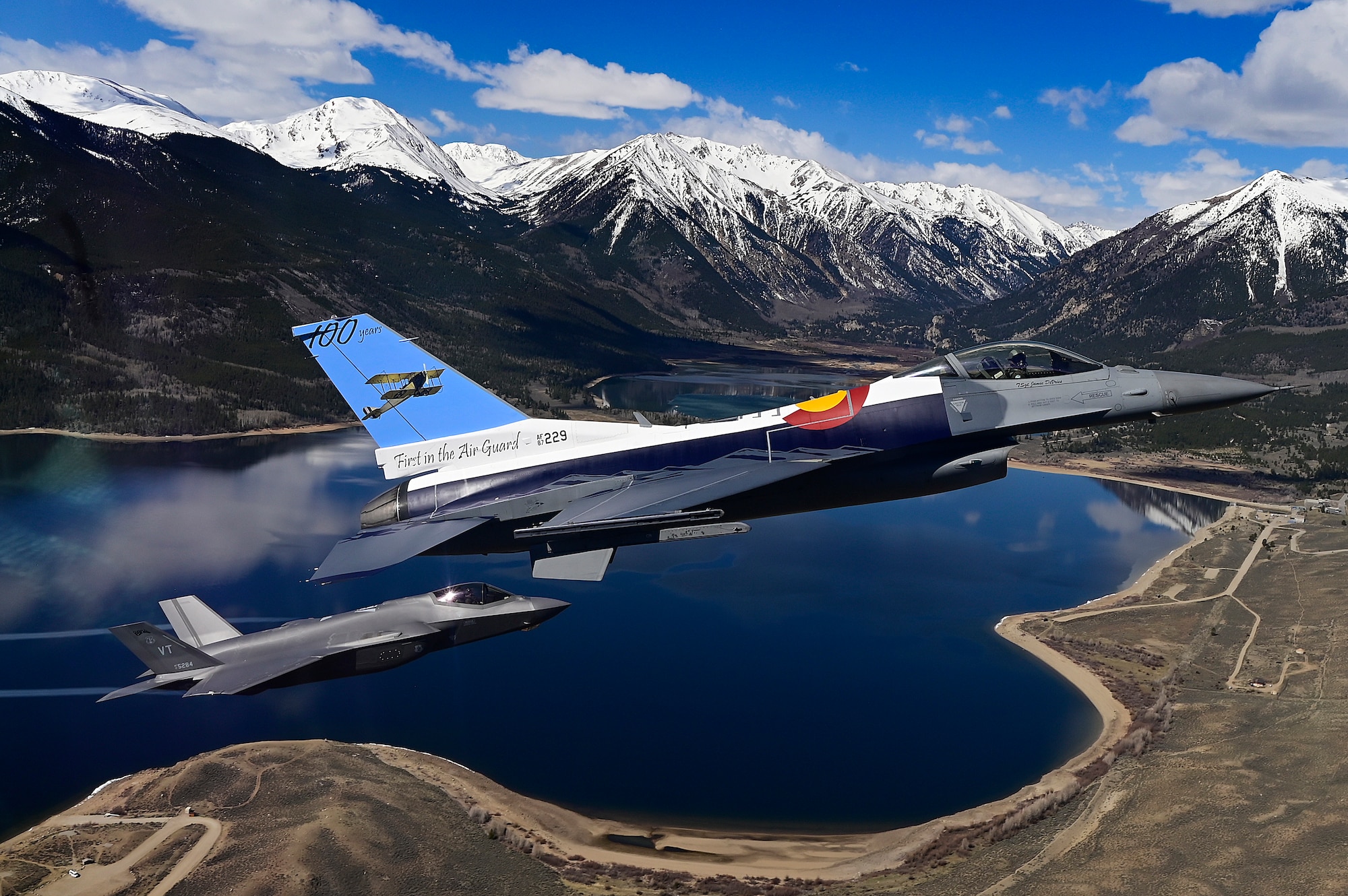 An F-16C Fighting Falcon assigned to the 120th Fighter Squadron, Colorado Air National Guard, painted to commemorate the 100th anniversary of the unit, flies with an F-35A Lightning II, assigned to the 134th Fighter Squadron, Vermont Air National Guard, over Leadville, Colo., May 8, 2023. Today the 120th FS is a dual-purpose fighter squadron with pilots qualified to perform