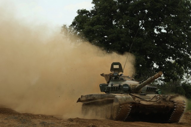 NOVO SELO TRAINING AREA, Bulgaria ¬– A Bulgarian T-72 battle tank from 3rd Battalion, 61st Mechanized Brigade, approaches the forward line of troops at Novo Selo Training Area, Bulgaria, during Saber Guardian 21, May 27, 2021.