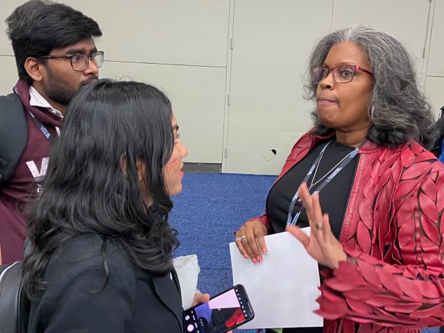 Gayna Malcolm-Packnett, right, from the Army Office of Small Business Programs, speaks with two students during the BEYA Conference in Baltimore.