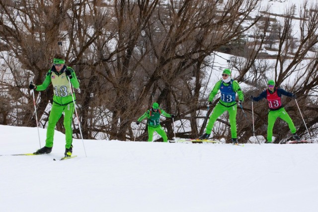 The Washington National Guard men’s Patrol Team climbs an incline during the 50th anniversary Chief of the National Guard Bureau Biathlon Championships at Soldier Hollow Nordic Center Feb. 21, 2024. The Utah National Guard hosted the national biathlon competition consisting of cross-country skiing and competitive shooting events that tested the warriors’ endurance and marksmanship. (U.S. Army Photo by Staff Sgt. William Cowley)