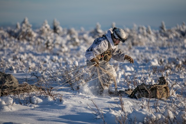 Soldiers, Airmen and Marines took part in a joint multi-battalion, joint force entry exercise into the Donnelly training center drop zone, north of Fort Greely. Soldiers also faced the challenge of disguising equipment in a snowy environment.
