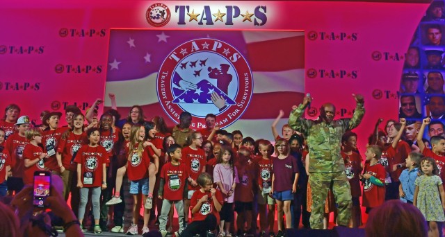 Senior Enlisted Advisor Tony L. Whitehead, SEA to the chief, National Guard Bureau, cheers with surviving military children during the Tragedy Assistance Program for Survivors’ 29th Annual National Military Survivor Seminar and Good Grief Camp, Arlington, Virginia, May 29, 2023. The seminar welcomes hundreds of surviving military families to the nation’s capital over Memorial Day weekend every year. (U.S. Army National Guard photo by Sgt. 1st Class Elizabeth Pena)