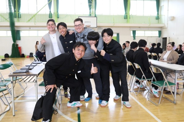 Camp Zama volunteers and students pause to take a photo together during an English Challenge Day held March 5 at Nishi Junior High School.