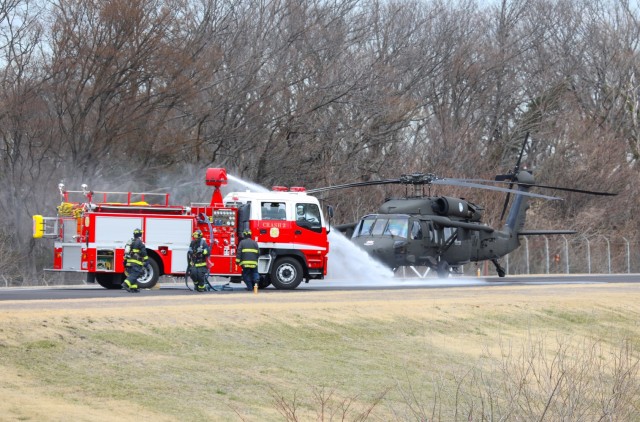 U.S. Army Garrison Japan firefighters arrived at the scene within two minutes while using radio communication to coordinate their efforts with the air traffic control tower.