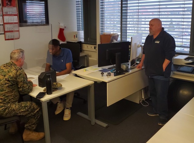 Bill Johnson, the chief of the Personal Property Processing Office at Logistics Readiness Center Stuttgart, (right) observes Trey Bailey, a PPPO transportation assistant, as he assists a Navy captain with his outbound household goods shipment planning. Johnson said peak permanent change of duty station will be starting in about a month, and it’s going to get extremely busy.