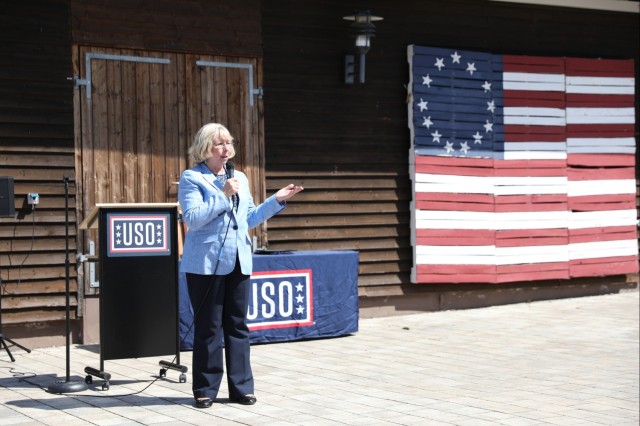 Catherine Ehlers Metcalf, daughter of U.S. Army Veteran Walter David Ehlers, expresses her appreciation to all of the participants of Victory Corps’ Walter D. Ehlers Cup, at Grafenwoehr, Germany, June 4, 2023. The Walter D. Ehlers’ Cup, named after a Congressional Medal of Honor recipient, tests officers, noncommissioned officers, and junior enlisted Soldiers on a slew of events that encompass general tasks and drills. (U.S. Army Photo by Sgt. Khalan Moore)