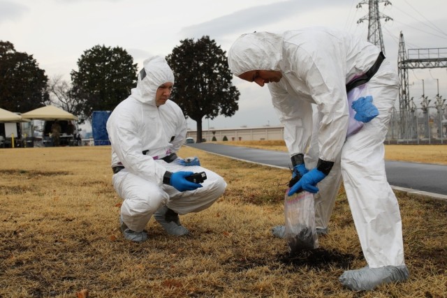 Maj. Daniel Arguello, Public Health Command–Pacific’s Chief of Health Physics, right, puts a soil sample in a bag during a March 12 exercise on Sagami General Depot with assistance from Staff Sgt. Kevin Stringer, assigned to Tripler Army Medical Center in Hawaii, left.
