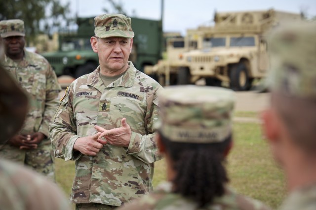 Sgt. Maj. of the Army Michael R. Weimer visits with Soldiers of Task Force Talon, Guam, Feb. 7, 2023. Talon is comprised of both Active Duty and Guard Soldiers from the 38th Air Defense Artillery and Guam National Guard, respectively, and operates the Terminal High Altitude Area Defense (THAAD) system on Guam.