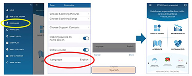 Changing PTSD Coach from English to Spanish / Cómo cambiar PTSD Coach de inglés a español: