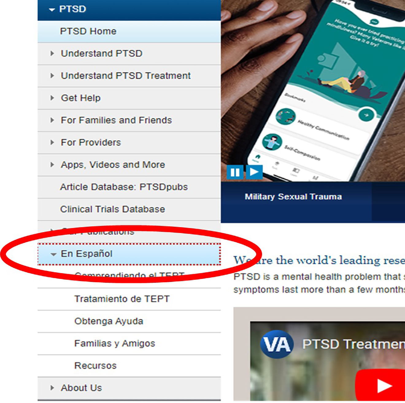 El mejor lugar para comenzar a obtener información en español sobre el PTSD es el sitio web del Centro Nacional para el PTSD. Desde cualquier página del sitio, está a solo dos clics de distancia del material en español. Hay un enlace “en español” a lo largo del lado izquierdo de cada página, justo arriba de donde dice “Acerca de nosotros”. Desde allí, puede elegir una sección del sitio en español para explorar.