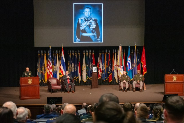 Gen. Songwit Noonpackdee, Chief of Defense Forces, Royal Thai Armed Forces, addresses the crowd during his induction ceremony to the Command and General Staff College’s International Hall of Fame April 2, 2024, in Eisenhower Hall of the Lewis and Clark Center.