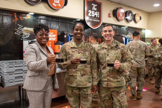 Chontrelle Sturdivant, the Installation Food Program manager, Col. Lakicia Stokes, U.S. Army Garrison-Fort Cavazos commander, and Lt. Col. Richard Martinez, Army Field Support Battalion Fort Cavazos commander, pose for a photo holding hot cups of coffee poured at The 254 Blend, located inside the Operation Iraqi Freedom Dining Facility. (U.S. Army photo by Samantha Harms, Fort Cavazos Public Affairs)