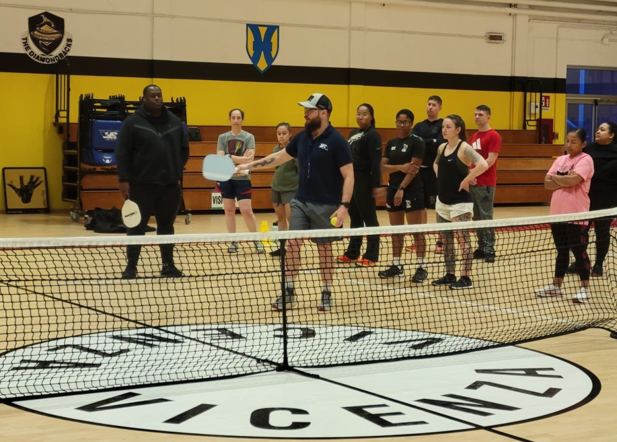 At a March 6, resiliency training event in the Vicenza Military Community, Eric Urrutia a Performance Expert, conducted a class for Public Health Activity Italy. Urrutia works at the R2 (Ready and Resilient) Performance Center located on Del Din. Instead of conducting a classroom style training event, Urrutia was able to teach Public Health Activity Italy about resiliency by teaming up with the Ederle Fitness Center Manager Joshua Grant. Grant taught everyone the basics of the sport pickle ball, while Urrutia focused on how resiliency can go hand in hand with learning a new skill.