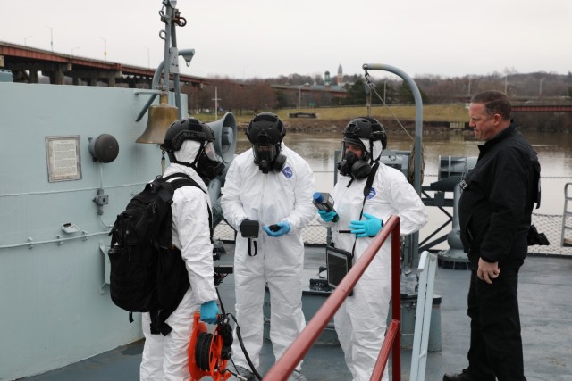 ALBANY, N.Y. – Twenty-one Soldiers and Airmen assigned to the New York National Guard’s 2nd Civil Support Team tested their ability to detect weapons of mass destruction aboard a World War II destroyer docked in downtown Albany.