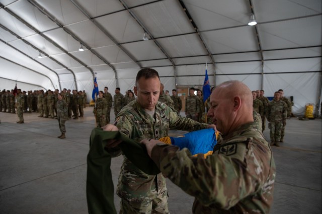 U.S. Army Lt. Col. Jeffrey A. Sills (left), commander of the 1st Battalion, 126th Aviation Regiment, Rhode Island Army National Guard (Task Force Rogue), and Command Sgt. Maj. Jodie M. Dove (right), uncased their unit’s flag, or colors, during a transfer of authority ceremony at Camp Bondsteel, Kosovo, Jun. 8, 2023. The uncasing of the colors signifies the start of the task force’s rotation in Kosovo and their commitment to keeping a safe and secure environment and freedom of movement for all people in Kosovo. (U.S. Army photo by Sgt. 1st Class Herschel Talley)