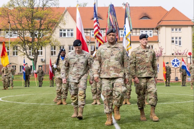 U.S. Army Col. Fred Dente, V Corps chief of staff, center, leads the corps formation during V corps’ change of command ceremony at Camp Kościuszko in Poznan, Poland, April 8, 2024. During the ceremony, Lt. Gen. Charles Costanza took over for Lt. Gen. John S. Kolasheski as commanding general of V Corps. (U.S. Army photo by Spc. Devin Klecan) (Photo Credit: Spc. Devin Klecan)