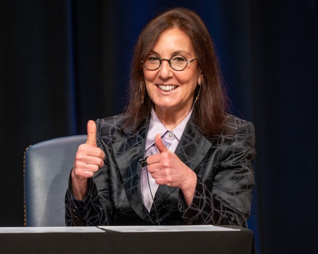 Assistant Secretary of the U.S. Army Installations, Energy and Environment Ms. Rachel Jacobson gives a thumbs-up during the Sourcewell Intergovernmental Support Agreement proclamation signing ceremony in the Pentagon auditorium, Arlington, Va., April 10, 2024. This first-of-its-kind sourcing agreement with the Sourcewell company allows for base supplies to multiple army installations while saving money, efficiently streamlining the supply process. (U.S. Army photo by Bernardo Fuller)