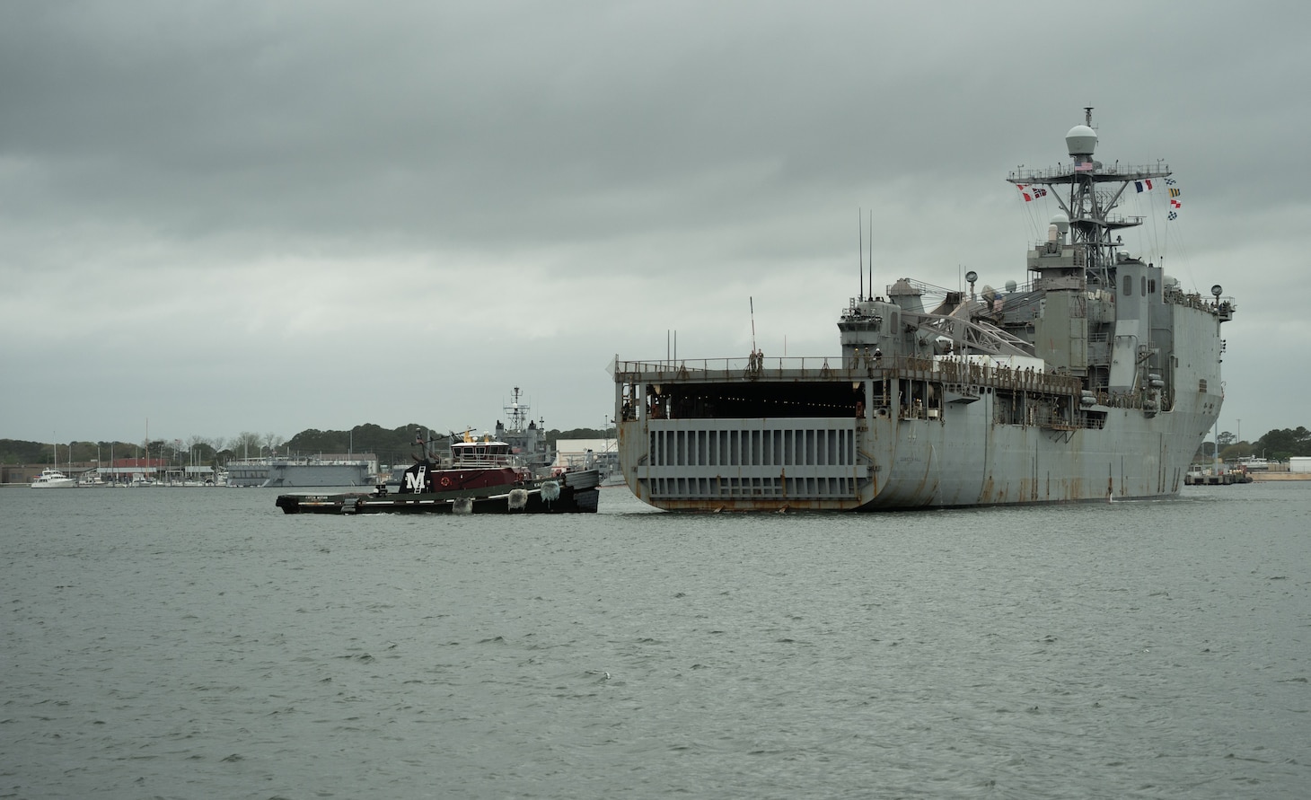 Gunston Hall departed Virginia late January this year. She sailed straight to Portsmouth, United Kingdom to embark part of the landing force, a platoon of French marines and six combat rigid raiding craft. Once embarked, Gunston Hall and her troops accomplished several amphibious training exercises in the English Channel to build proficiency and familiarity before the more complicated next phase. Subsequently, Gunston Hall sailed directly north into the harsh climate of the Arctic Circle to work alongside Italian Landing Assault Helicopter Ship Giuseppe Garibaldi, Italian amphibious transport dock San Giorgio, and French Navy Aquitaine-class frigate Normandie.