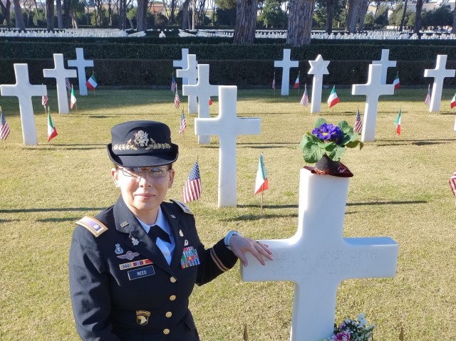 U.S. Army Lt. Col. Rosemary Reed, assigned to NATO Joint Forces Command Naples J9, pays her respects at the grave of 2nd Lt. Ellen Ainsworth, 56th Evacuation Hospital, who received the Silver Star posthumously for the sacrifices she made treating the woundedduringt the Battle of Anzio. Reed visited the Sicily-Rome American Cemetery Jan. 24 to honor the fallen on the 80th anniversary of the allied forces landing for World War II’s Battle of Anzio. (Courtesy photo)
