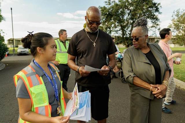 HELEMANO MILITARY RESERVATION, Hawai’i — Community engagement was in full stride at the Helemano Military Reservation during a “Walking Town Hall” held April 17. Kicking off at 3:30 p.m. Hawai’i Standard Time at the Helemano Community Center, the gathering featured U.S. Army Garrison Hawai’i, Garrison Commander Col. Steven McGunegle, representatives from Hawaiian Electric Company (HECO), Island Palm Communities (IPC) and the Housing Services Office (HSO), housing team.