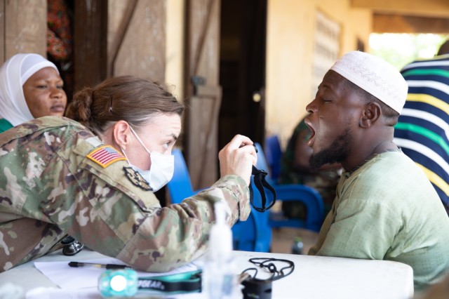 An emergency medicine physician with the U.S. Army 352nd Civil Affairs Command, diagnoses a Ghanaian civilian near Yendi, Ghana, June 3, 2023. (Photo Credit: Staff Sgt. Nathan Baker, U.S. Army)