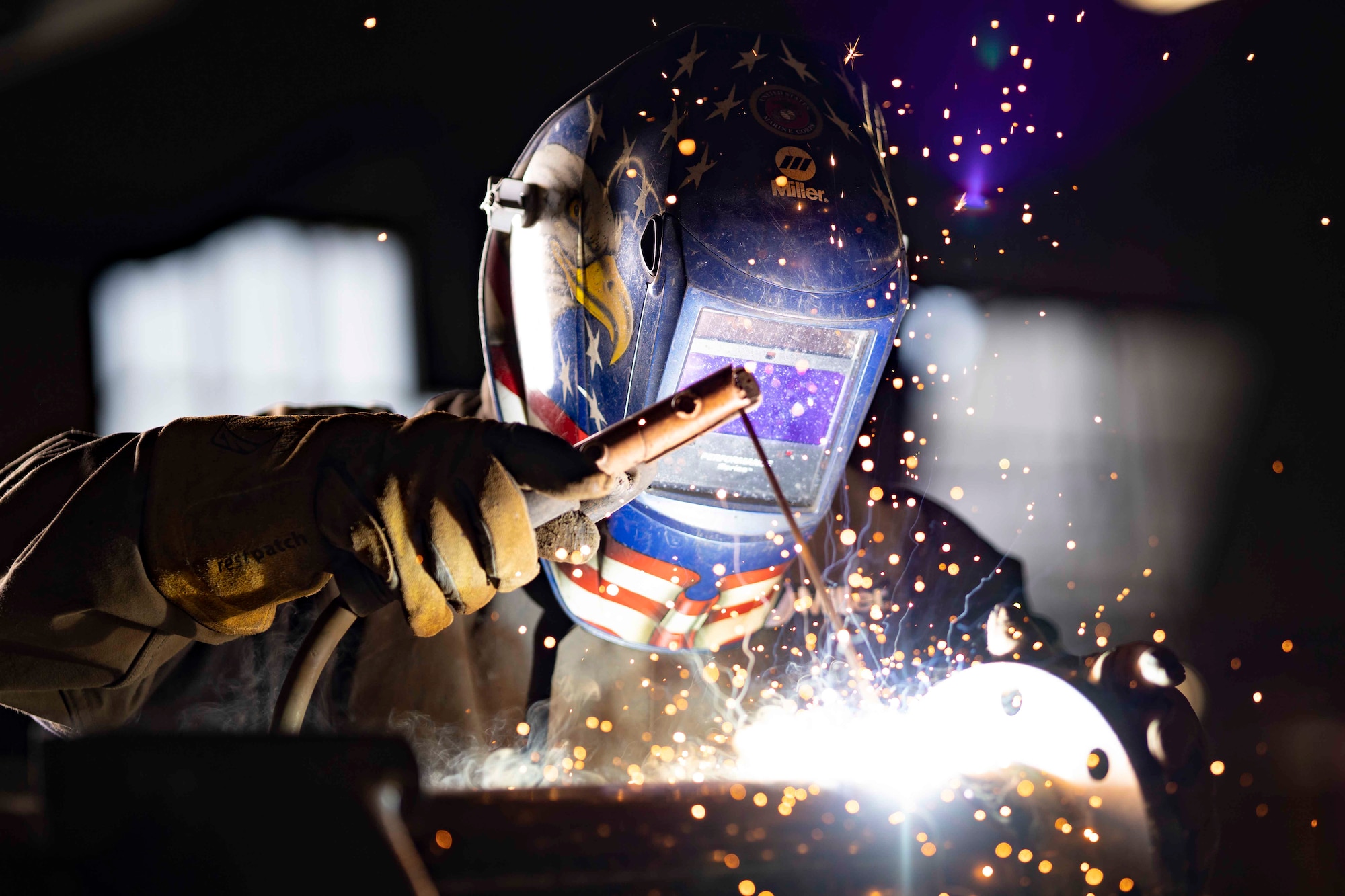 Carlos Ramirez, 502nd Civil Engineer Squadron structures shop welder, welds a boiler pipe flange at Joint Base San Antonio-Fort Sam Houston, Texas, June 8, 2023. The welding shop at 502nd CES has completed more than 1,000 welding jobs this year, allowing the training mission at JB San Antonio-Fort Sam Houston to continue unabated. (U.S. Air Force photo by Jonathan Mallard)