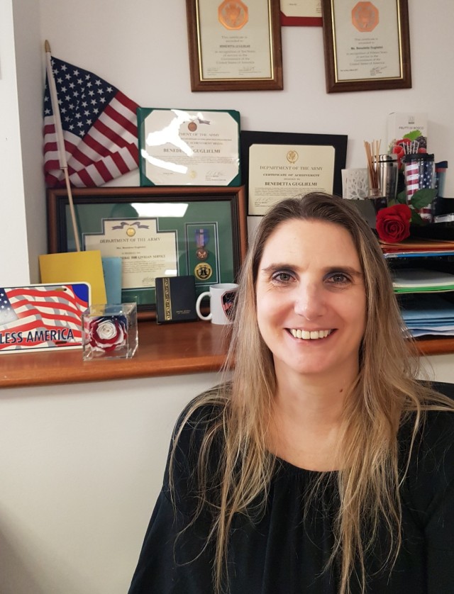 Guglielmi is proud of her achievement and proud to work for LRC Italy, 405th AFSB. And her U.S. flag collection at her office proves just how proud she is and just how much she loves working for the U.S. Army
