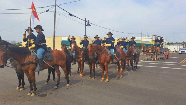 Twelve 1st Cavalry Division Horse Cavalry Detachment Soldiers, dressed in traditional uniforms and carrying the detachment guidon, traveled on 10 horses, followed by a wagon pulled by two mules during the annual Juneteenth Celebration Parade June 17 in downtown Killeen. (U.S. Army photo by Janecze Wright, Fort Cavazos Public Affairs)