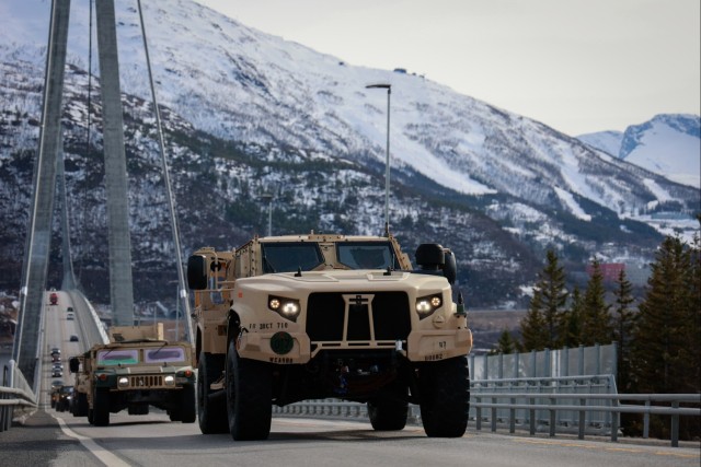 Soldiers from 3rd Brigade Combat Team, 10th Mountain Division, conduct the first U.S. Army convoy movement from the port of Narvik, Norway, to Evenes, Norway, on April 26, 2024. This is the first time the U.S. Army has conducted a convoy movement in Norway. As a part of DEFENDER 24, 3rd Brigade Combat Team, 10th Mountain Division is transporting vehicles and equipment for the first time in Norway. This convoy in the high north allowed 3rd BCT, 10th Mtn. Div. Soldiers to establish a high north task force, and conduct a long-distance road march through Sweden to Finland, including a rail gauge change in Sweden, to participate in the Norwegian national exercise Northern Forest. DEFENDER is the Dynamic Employment of Forces to Europe for NATO Deterrence and Enhanced Readiness, and is a U.S. European Command scheduled, U.S. Army Europe and Africa conducted exercise that consists of Saber Strike, Immediate Response, and Swift Response. DEFENDER 24 is linked to NATO’s Steadfast Defender exercise, and DoD’s Large Scale Global Exercise, taking place from 28 March to 31 May. DEFENDER 24 is the largest U.S. Army exercise in Europe and includes more than 17,000 U.S. and 23,000 multinational service members from more than 20 Allied and partner nations, including Croatia, Czechia, Denmark, Estonia, Finland, France, Germany, Georgia, Hungary, Italy, Latvia, Lithuania, Moldova, Netherlands, North Macedonia, Norway, Poland, Romania, Slovakia, Spain, Sweden, and the United Kingdom. (U.S. Army photo by Spc. Samuel Signor) (Photo Credit: Spc. Samuel Signor)