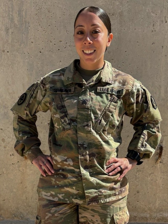 U.S. Army Sgt. Lauren Shalabi, an automated logistics specialist assigned to the 250th Brigade Support Battalion, 44th Infantry Brigade Combat Team, New Jersey Army National Guard, poses for a photo in Syria, April 24, 2024. Shalabi’s quick response resulted in saving a severely injured civilian contactor in Syria.