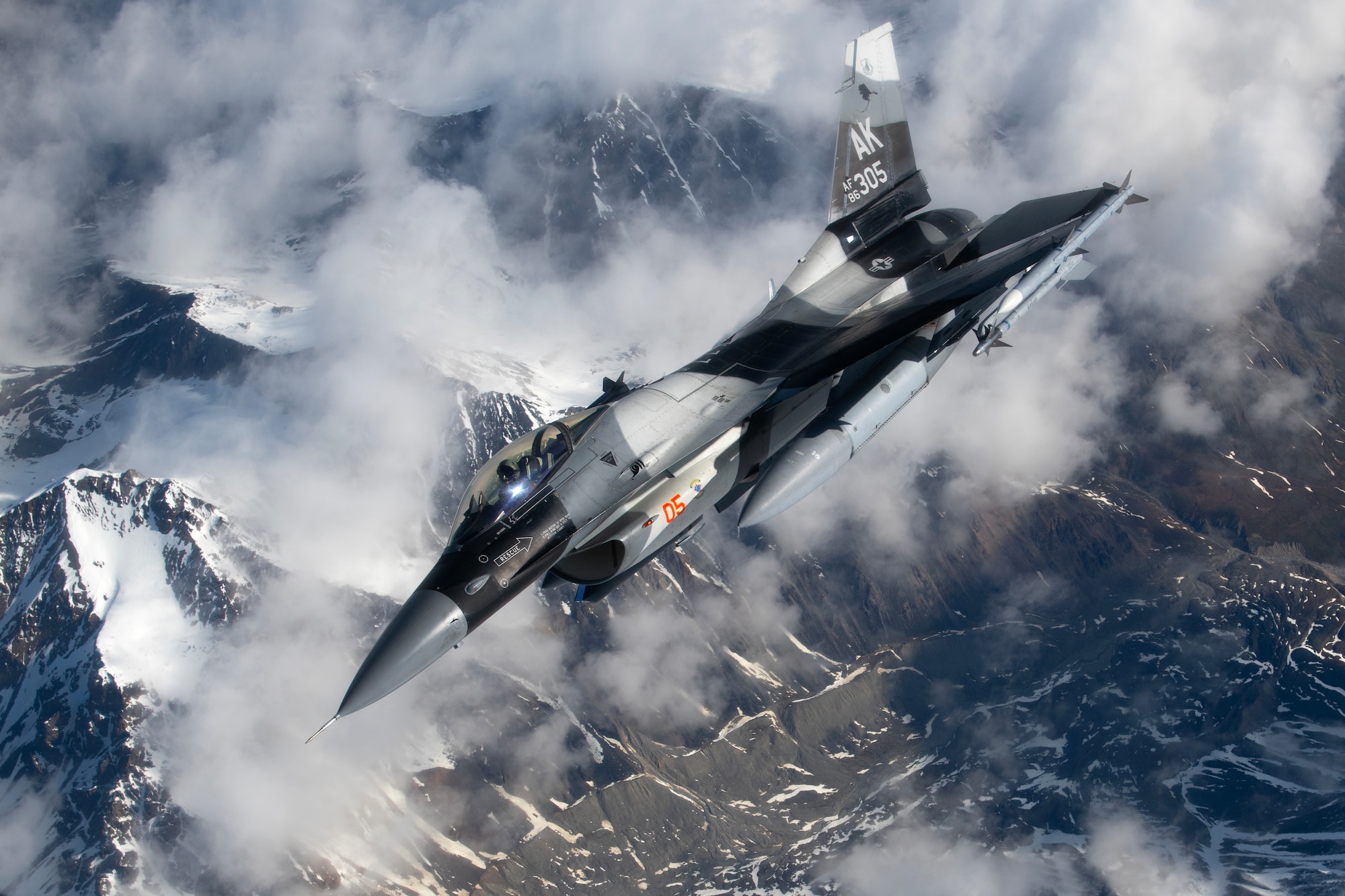 An F-16 Fighting Falcon assigned to the 18th Aggressor Squadron, Eielson Air Force Base, Alaska, departs after receiving aerial refueling during exercise Red Flag-Alaska 23-2, over the Joint Pacific Alaska Range Complex, June 14, 2023. RF-A is an advanced aerial combat training exercise that provides U.S. joint and allied forces an opportunity to integrate and improve interoperability through the exchange of tactics, techniques and procedures. (U.S. Air Force photo by Staff Sgt. Jessi Roth)