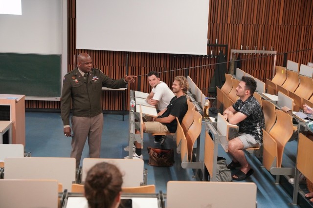 Col. Kevin A. Pool, U.S. Army Garrison Bavaria commander, spoke to University of Regensburg students about different leadership styles as well as his own experiences and challenges June 21, 2023 at the university campus.