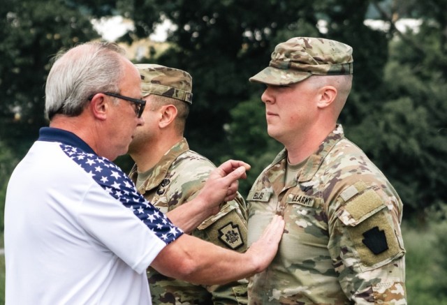 Joseph Ellis, right, who was promoted from sergeant to staff sergeant, gets his new rank was pinned on by his father during a ceremony at Fort Indiantown Gap, on July 9, 2023.
