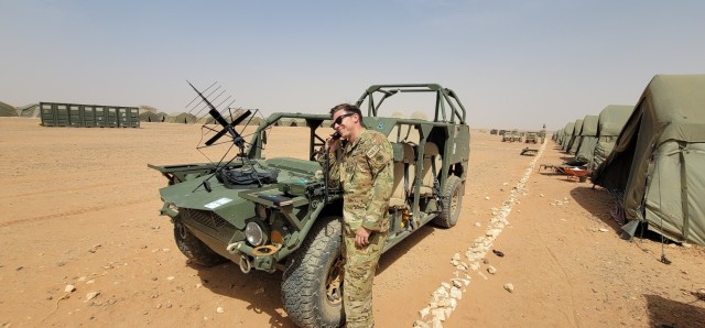 Guerir Labouihi training complex, Morocco U.S. Air Force Lt. Col. Stephen “DISCO” Parsons conducts communications check with C-130 and C-17 aircraft back at Aviano Air Force Base, Italy on June 21, 2022. The aircrafts will conduct a Joint Forcible Entry with paratroopers from 2nd Battalion (Airborne), 503rd Infantry Regiment “The Rock,” 173rd Airborne Infantry Brigade Combat Team. (Photo by U.S. Air Force Lt. Col. Stephen L. Parsons)