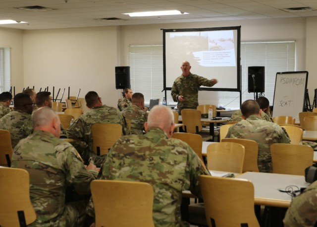 FORT INDIANTOWN GAP, Pa. – U.S. Army Col. Stuart James, the First Army Senior Regular Army Advisor to the Pennsylvania National Guard, instructed the Headquarters and Headquarters Company of the 56th Stryker Brigade Combat Team, 28th Infantry Division, Pennsylvania Army National Guard, on Engagement-Area Development [EA Dev] here May 14.