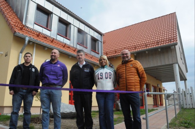 Angela Johnson, deputy garrison manager for the Hohenfels community, cut the ribbon with members of the Directorate of Public Works, who handed over the keys to the Directorate of Emergency Services, who also helped cut the ribbon.