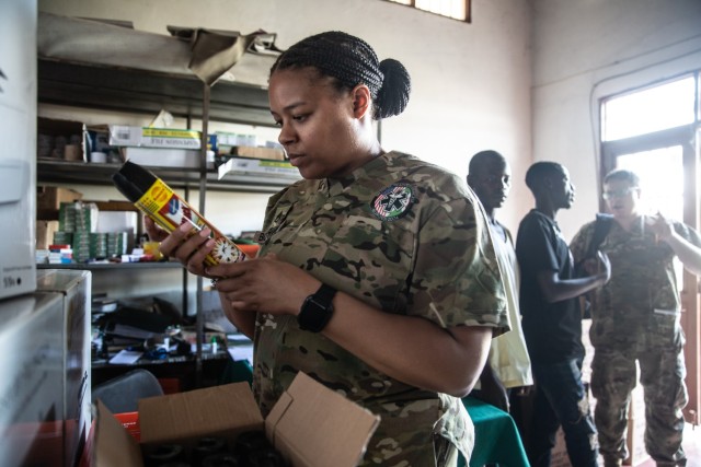 U.S. Army Staff Sgt. Erin Bothwell, a preventative medicine specialist (68S), assigned to the 172nd Medical Detachment, 261st Medical Battalion, 44th Medical Brigade, analyzes pesticides used at the Komenge Mil Hospital to better understand the environment our Burundi National Defence Force counterparts work in a day-to-day basis to help them assess their safety goals during the Medical Readiness Exercise (MEDREX) in Bujumbura Burundi, on April 12, 2024. MEDREX is a medical readiness exercise program, planned and executed by the U.S. Army Southern European Task Force, Africa (SETAF-AF), that allows military health professionals from the U.S. and their African partners to exchange medical practices, procedures and techniques that build and strengthen treatment capabilities, resulting in lasting relationships between the partners. (U.S. Army photo by Sgt. Anthony Hopper)