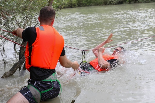 U.S. Army Officer Candidate Brian Luckenbill, New Jersey OCS Class 67, 254th Training Regiment, conducts water crossing familiarization training with Albanian Armed Forces Cadets in Rreth-Greth, Albania, May 16, 2024. New Jersey and New York National Guard Soldiers trained with cadets from the Albanian Military Academy. (U.S. Army National Guard photo by Capt. Kenneth Meisner)