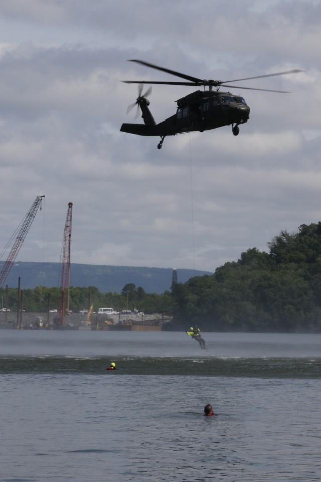 The Helicopter Aquatic Rescue Team, comprising the Tennessee Army National Guard’s 1-230th Assault Helicopter Battalion and Nashville Fire Department rescue divers, demonstrated its capabilities along the Tennessee River in Hamilton County. The 45th Civil Support Team simulated boat rescues in flooded areas.