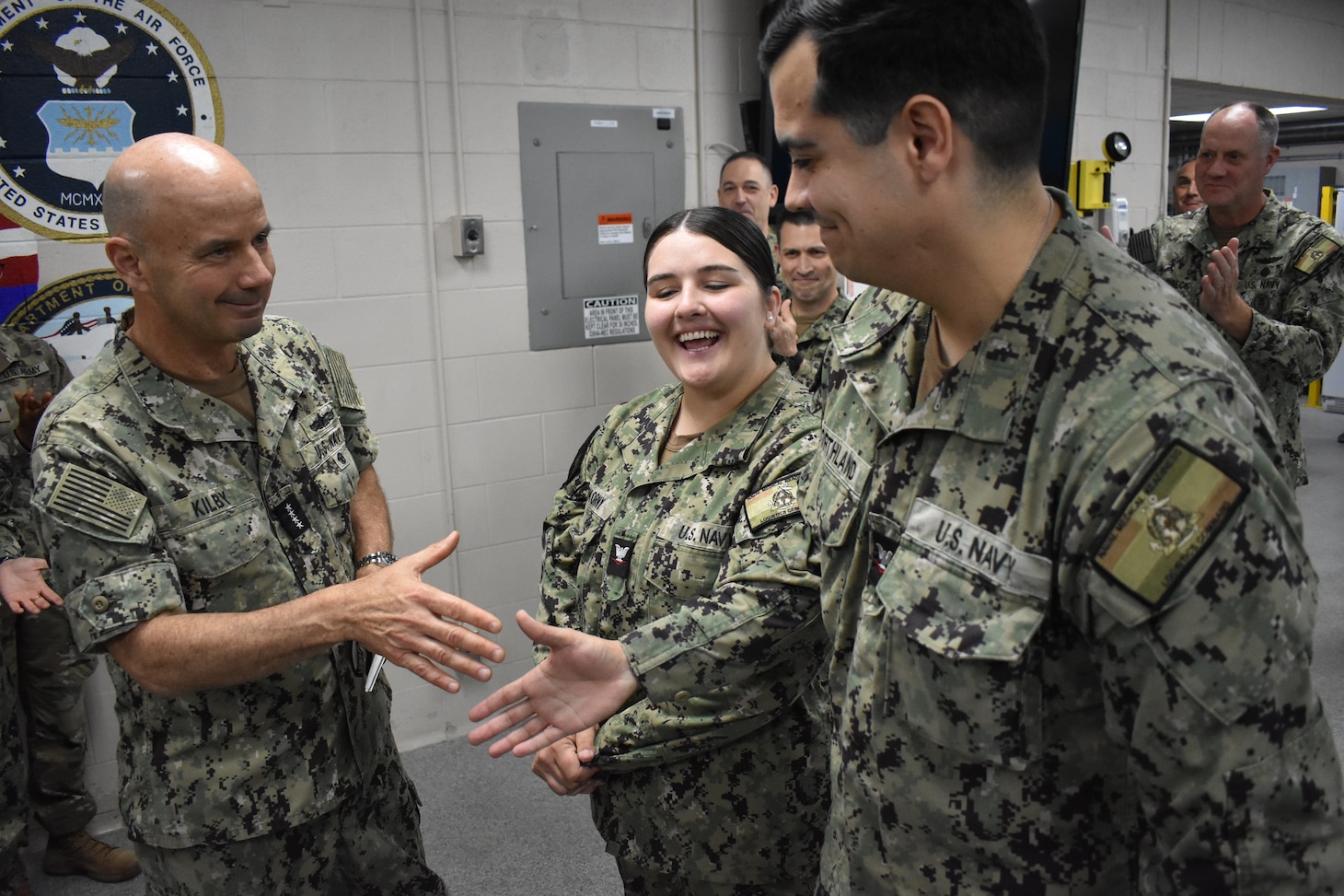 Two Sailors learned they were promoted to the next highest paygrade when Adm. Kilby summoned Hospital Corpsman 3rd Class Avey Pokorny and Hospital Corpsman 3rd Class Michael Northland front and center. They weren’t sure why they were being called out by the Kilby. They were happy to learn of their promotions.