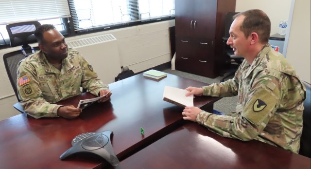 Chief Warrant Officer 3 Robert Nesbeth, Materiel Readiness Division, U.S. Army Sustainment Command Support Operations, confers with a colleague at U.S. Army Sustainment Command headquarters, Rock Island Arsenal, Illinois. (Photo by Greg Wilson, ASC Public Affairs)