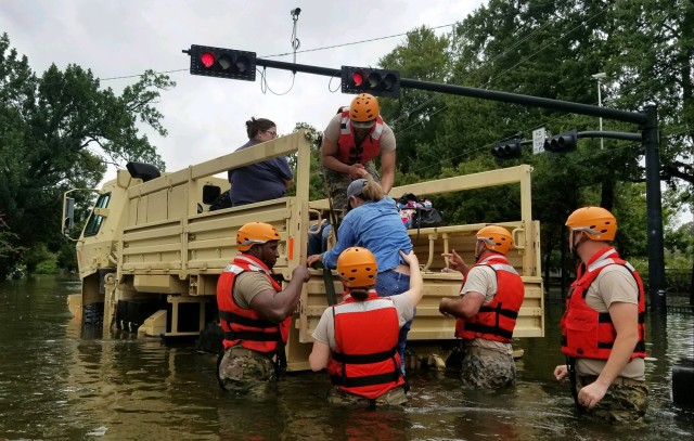 Soldiers with the Texas Army National Guard rescue Houston residents as floodwaters from Hurricane Harvey continue to rise, Monday, August 28, 2017. More than 12,000 members of the Texas National Guard have been called out to support local authorities in response to the storm.