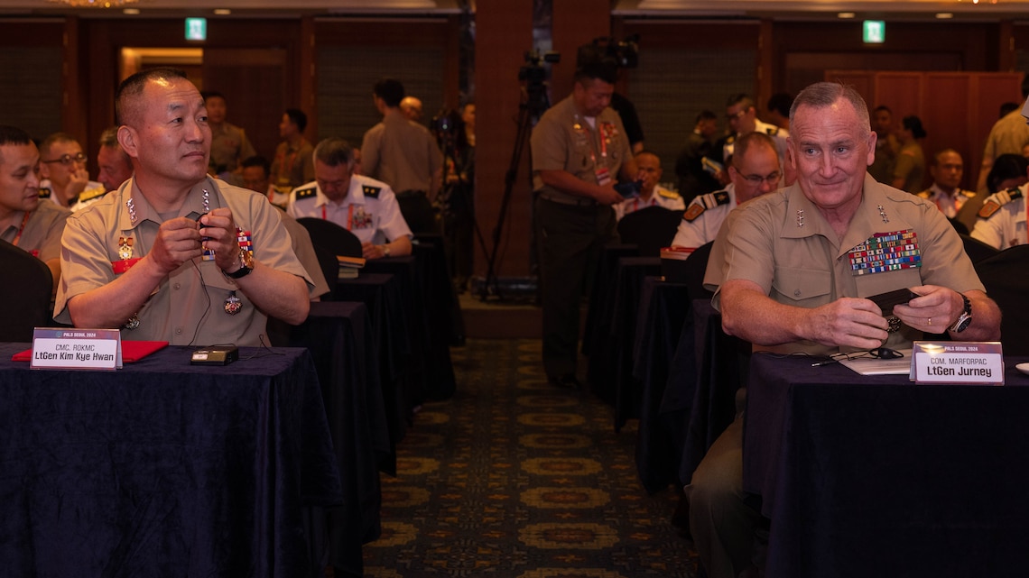 Lt. Gen. William Jurney, commander, U.S. Marine Corps Forces, Pacific, and Lt. Gen. Kim Kye-Hwan, Commandant of the Republic of Korea Marine Corps, conclude the 10th annual Pacific Amphibious Leaders Symposium during the closing ceremony in Seoul, South Korea, June 5, 2024.
