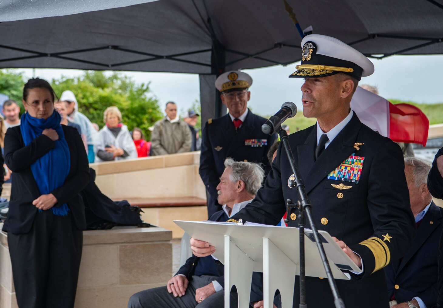 Before the monument’s dedication, Davids and NSW Force Master Chief Walter Dittmar paid their respects at the NCDU and S&R gravesites in the Normandy American Cemetery and Monument. This cemetery, where over 9,000 American service members are interred, honors those who fell during the Normandy invasion from June 6 to August 30, 1944.