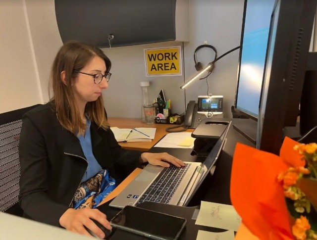 Giorgia Polo, Admin Support Specialist for the 414th Contracting Support Brigade at her desk on Caserma Ederle. Polo was recognized on May 30 at the garrison quarterly award ceremony for volunteering for the Italian cultural integration program dream team.